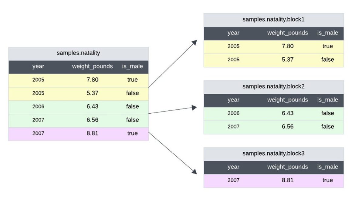 Considering the query above, BigQuery first scans the index to identify relevant blocks. Since the maximum value of `weight_pounds` in block 2 is 6.56 and the query filters on ‘weight_pounds’ >= 7, we know we can safely skip that block without even inspecting it. The original query then runs only against block 1 and any newer block(s) that haven’t been indexed yet — in this case, block 3. The results are combined and returned to the user.