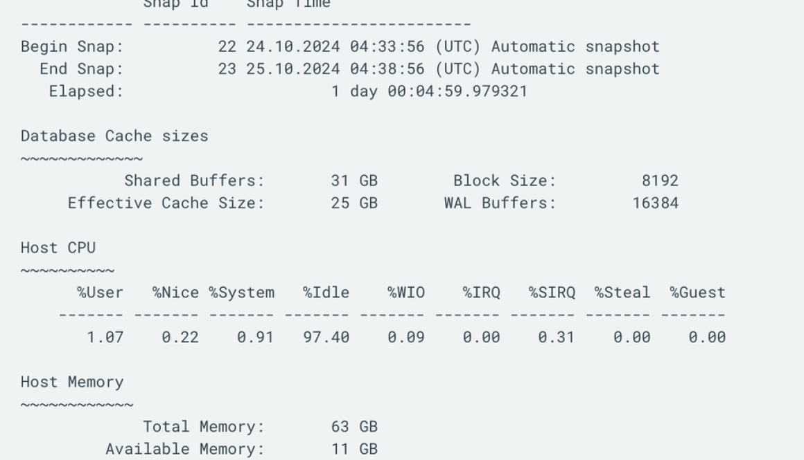 The performance snapshot report captures snapshots of your database’s performance metrics at any point during workload execution and generates reports based on any two snapshots. This gives you granular control over what periods you want to analyze, whether it’s the entire workload, specific intervals, or moments of peak activity. Each snapshot captures a wealth of information, including changes in key performance indicators like wait events, I/O statistics, and query execution times. It also captures system configuration details such as CPU usage, memory allocation, and parameter details.