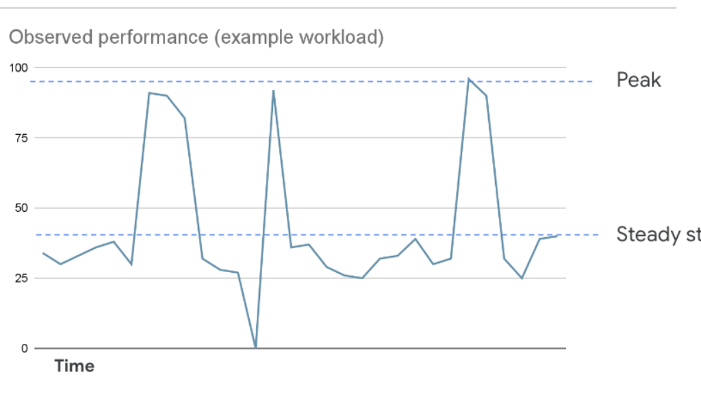 Customers have told us that they struggle to balance utilizing all of their block storage performance resources while ensuring their workloads have the resources they need to succeed. The root cause of this challenge is what is often called the “sum of peaks” problem. In order to ensure their workloads are never starved of performance, customers will provision their block storage for the highest performance they’ve observed, however most of the time their disks consume significantly less than that performance. This means that your disks are at chronic low performance utilization. We’ve visualized this phenomenon below.
