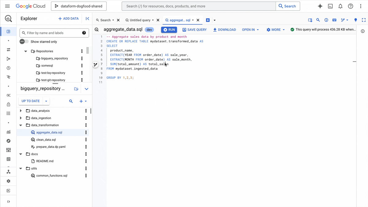BigQuery repositories help organizations standardize the way code is developed, version, and deployed. Data teams with members of different levels of technical expertise can all collaborate on the same code base, following the same software engineering best practices.