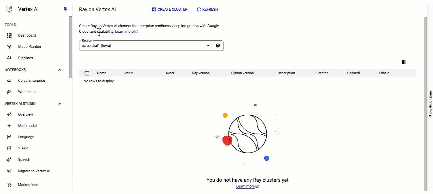 Accelerated and Scalable AI Development: Ray’s distributed computing framework provides a unified experience for both generative AI and predictive AI, which seamlessly integrates with Vertex AI’s infrastructure services. Scale your Python-based machine learning, deep learning, reinforcement learning, data processing, and scientific computing workloads from a single machine to a massive cluster, so you can tackle even the most demanding AI challenges without the complexity of managing the underlying infrastructure.