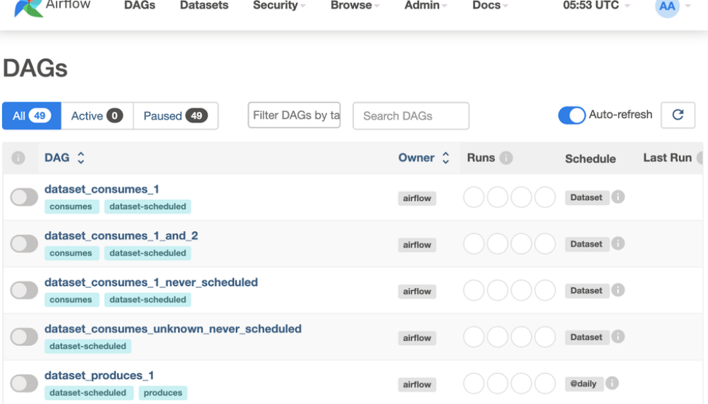 Finally, let’s connect to Airflow by clicking the link to the Airflow webserver entry above. If you have the correct IAM permissions, you should see something like the screen below: