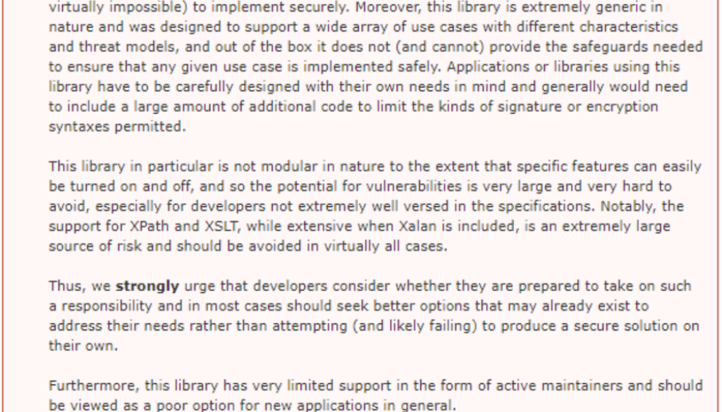 Figure 2: Apache Santuario added a disclaimer suggesting to not use the xml-security-c library