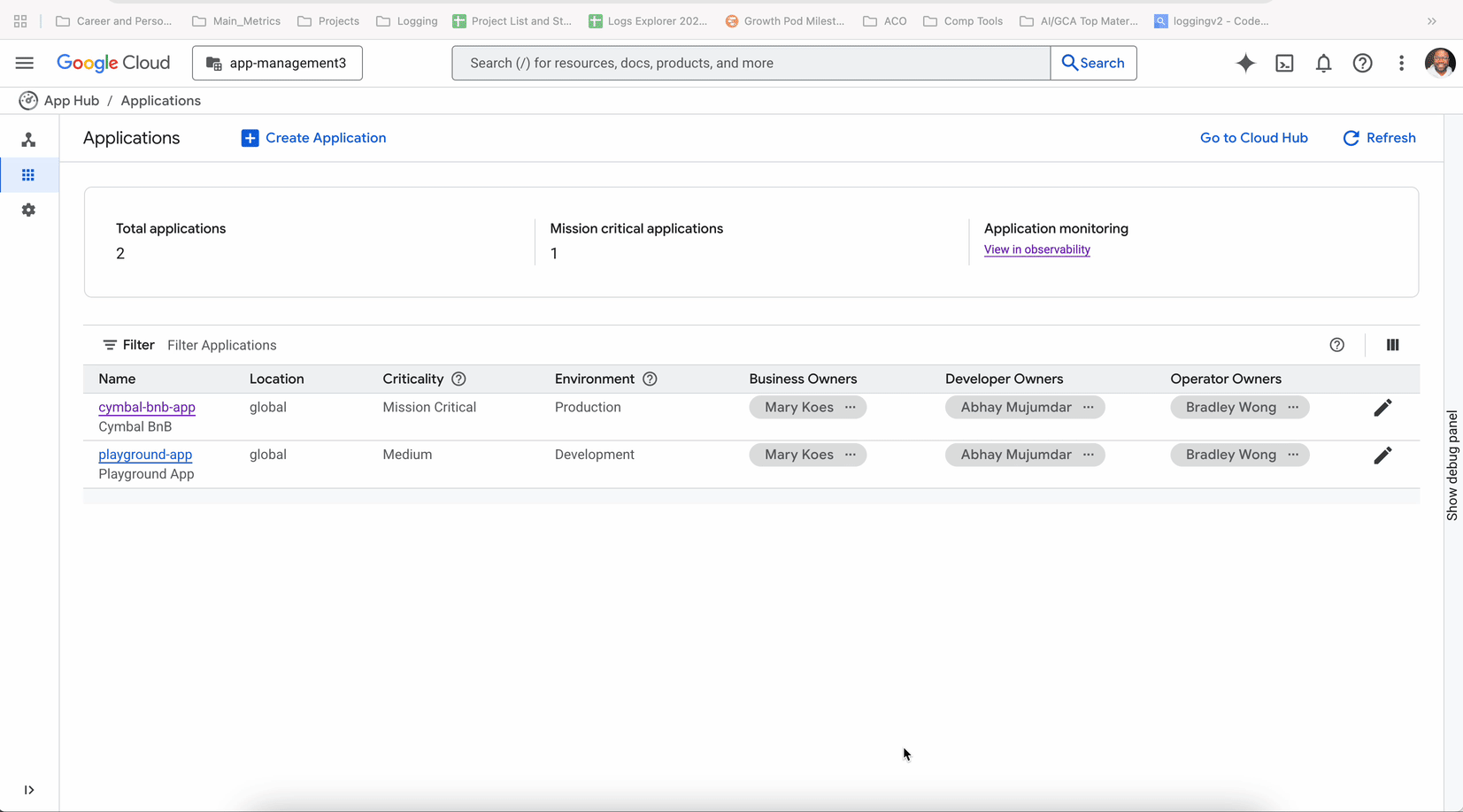 For example in the image below, a user defined an App Hub application called Cymbal BnB app, with multiple services and workloads. The flow below shows the automatically generated experience with golden signals, alerts and relevant logs.