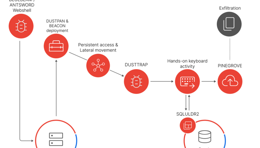 APT41 used a combination of ANTSWORD and BLUEBEAM web shells for the execution of DUSTPAN to execute BEACON backdoor for command-and-control communication. Later in the intrusion, APT41 leveraged DUSTTRAP, which would lead to hands-on keyboard activity. APT41 used publicly available tools SQLULDR2 for copying data from databases and PINEGROVE to exfiltrate data to Microsoft OneDrive.