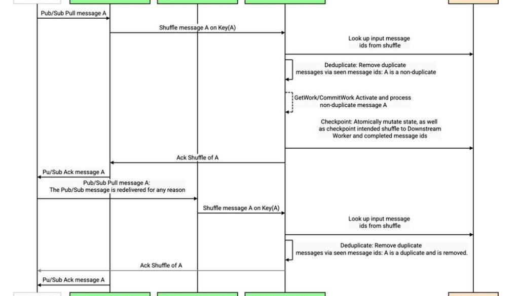 In order to perform deduplication, the backend worker puts these messages through a shuffle, attaching a key internally to each message. The key is chosen deterministically based on the message, or a message id attribute if configured, so that a replay of a duplicate message is deterministically shuffled to the same key. Doing so allows deduplicating replays from Pub/Sub in the same manner that shuffle replays are deduplicated between stages in the Dataflow pipeline (see this detailed discussion), as illustrated in the sequence diagram below: