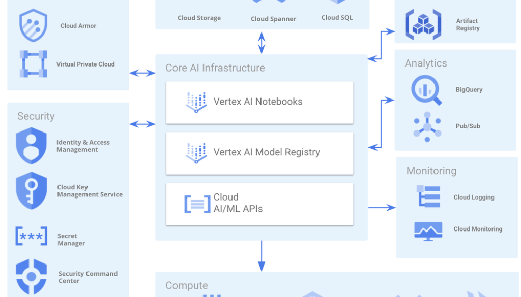 A typical generative AI workload is a complex ecosystem. It integrates AI-specific platforms like Vertex AI with foundational platform services that include Cloud Storage, Identity and Access Management (IAM), Secret Manager, Cloud Logging, and VPC Networks.