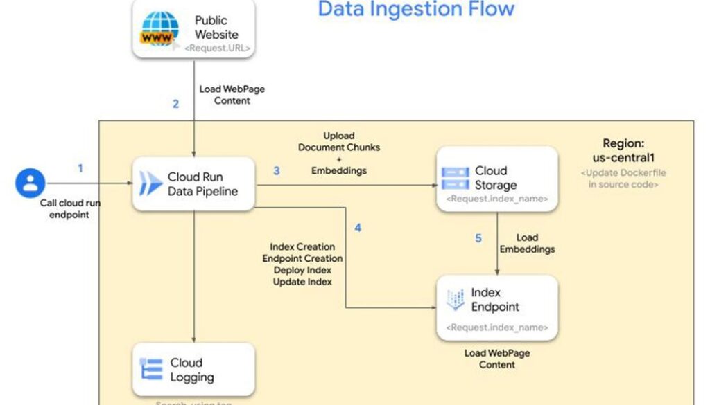 We streamline the data ingestion process, making it effortless to deploy a conversational search solution that draws insights from the specified webpages. Our approach leverages a combination of Google Cloud products, including Vertex AI Vector Search, Vertex AI Text Embedding Model, Cloud Storage, Cloud Run, and Cloud Logging.