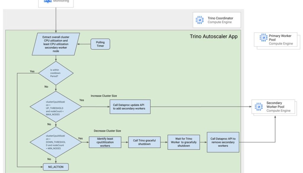 Trino is a popular, open-source, distributed SQL query engine for data lakes and warehouses. It is used by many businesses to analyze large datasets stored in Hadoop Distributed File System (HDFS), Cloud Storage, and other data sources. Dataproc is a managed Hadoop and Spark service that makes it easy to set up and manage clusters. However, Dataproc currently does not support autoscaling for workloads that aren’t based on Yet Another Resource Negotiator, or YARN, such as Trino.