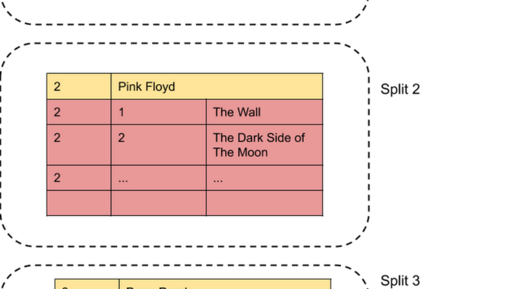 The data is stored into splits, where the primary key of the top level table determines the split point. The key ranges of the resulting splits are [Singers(-∞), Singers(1)) – not shown, [Singers(1), Singers(2)), [Singers(2), Singers(3)) and [Singers(3), Singer(+∞)) respectively.