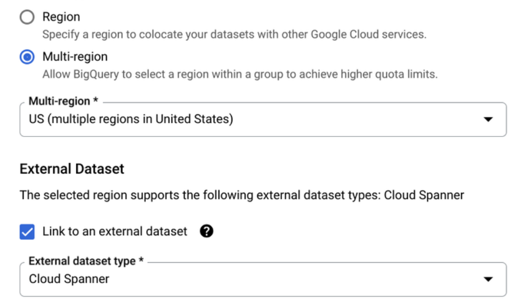 Let’s say that in Spanner you have a project named “myproject” with an instance “myinstance” and a database “ecommerce”, where you store current transactions from your ecommerce site. You can create an external dataset in BigQuery just like any regular dataset, only with an additional option “Link to an external database”: