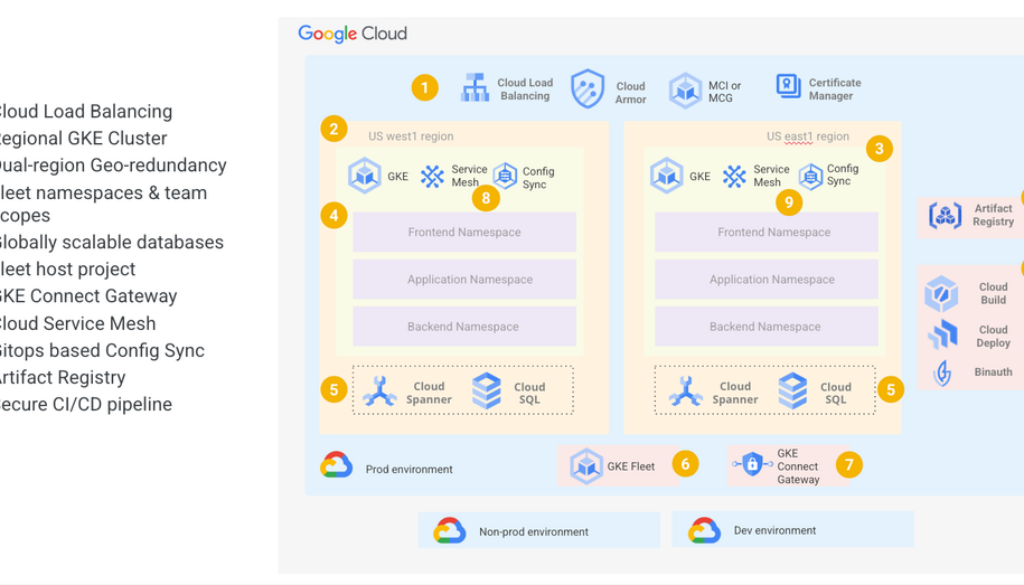 Beyond what we’ve discussed, several other crucial elements contribute to a successful internal developer platform. This includes robust application CI/CD pipelines, comprehensive logging, and monitoring solutions. To visualize how these pieces fit together, take a look at Figure 1 below. It illustrates the key components for building a highly available, multi-region IDP within the Google Cloud ecosystem.