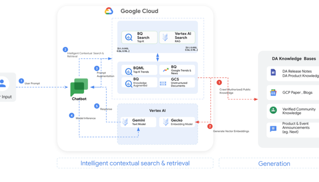 This phase utilizes the augmented prompt as input to the Gemini Pro model hosted on Vertex AI for inference. Additionally, it involves querying Vertex AI vector search index for contextually relevant documents based on the query embeddings. This enriched context, combined with the model’s inference capabilities, allows for generating nuanced and informed responses.