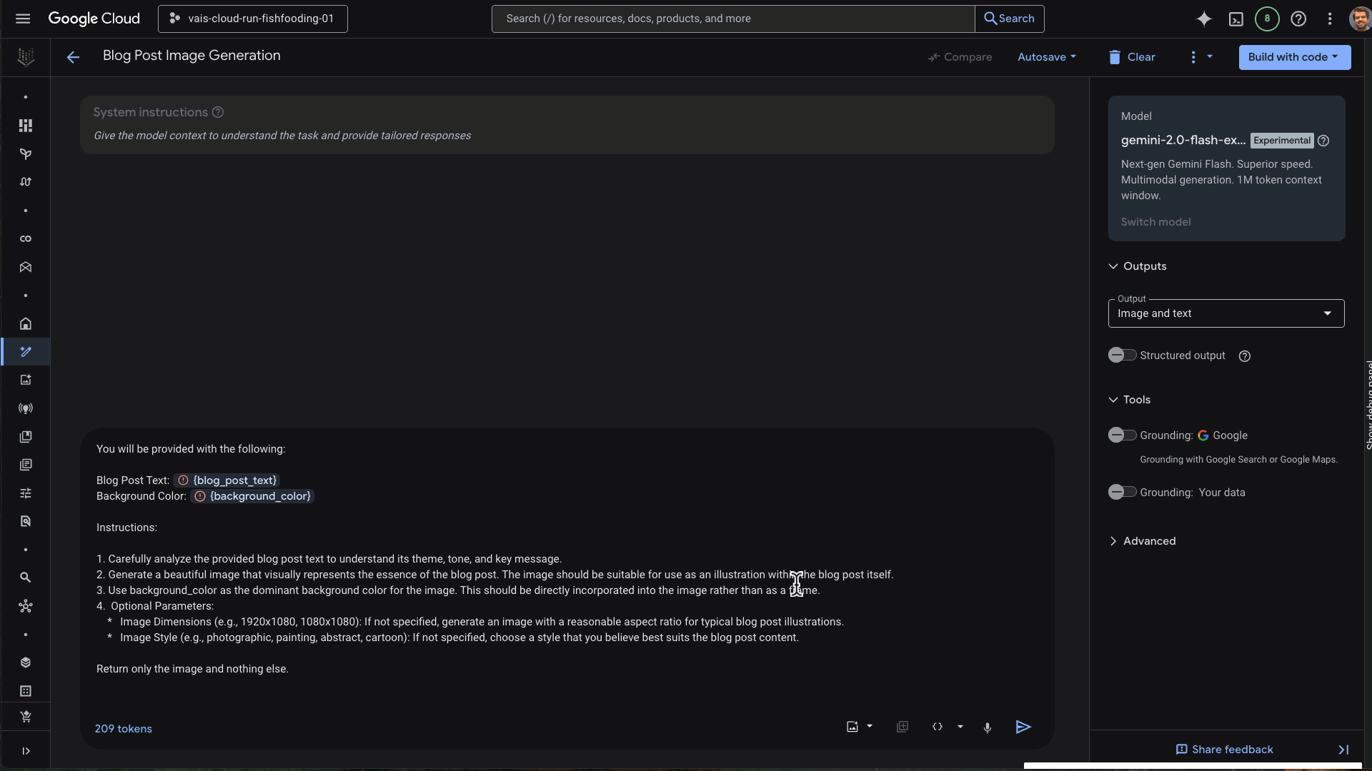Craft your prompt: Perfect your generative AI idea within the familiar Vertex AI Studio interface. Add system instructions, examples, and test until you’re happy.