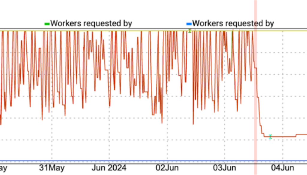 Case 1 – Load balancing reduced user-worker scaling events and allowed the pipeline to operate with better performance with fewer workers. (75% lower workers resulted in a daily cost reduction of 64% in Google Compute Engine, and the backlog dropped from ~1min to ~10s)
