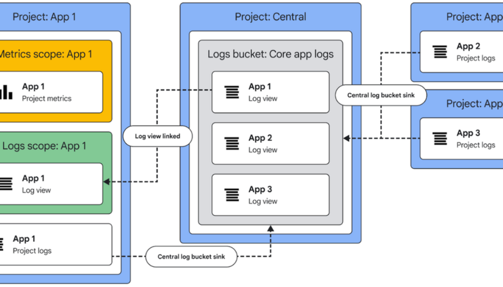 In a centralized log storage architecture, your organization could have routed all logs from applications to a centralized project (e.g. Project Central in Figure 1 below) using a bucket sink, in order to easily manage configurations, access control, and cost.