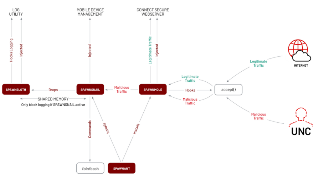 SPAWNMOLE is a tunneler that injects into the web process. It hijacks the accept function in the web process to monitor traffic and filter out malicious traffic originating from the attacker. The remainder of the benign traffic is passed unmodified to the legitimate web server functions. The malicious traffic is tunneled to a host provided by an attacker in the buffer. Mandiant assesses the attacker would most likely pass a local port where SPAWNSNAIL is operating to access the backdoor.