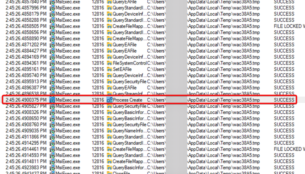 Figure 1: MSIExec.exe copying and executing .tmp file in user’s %TEMP% folder