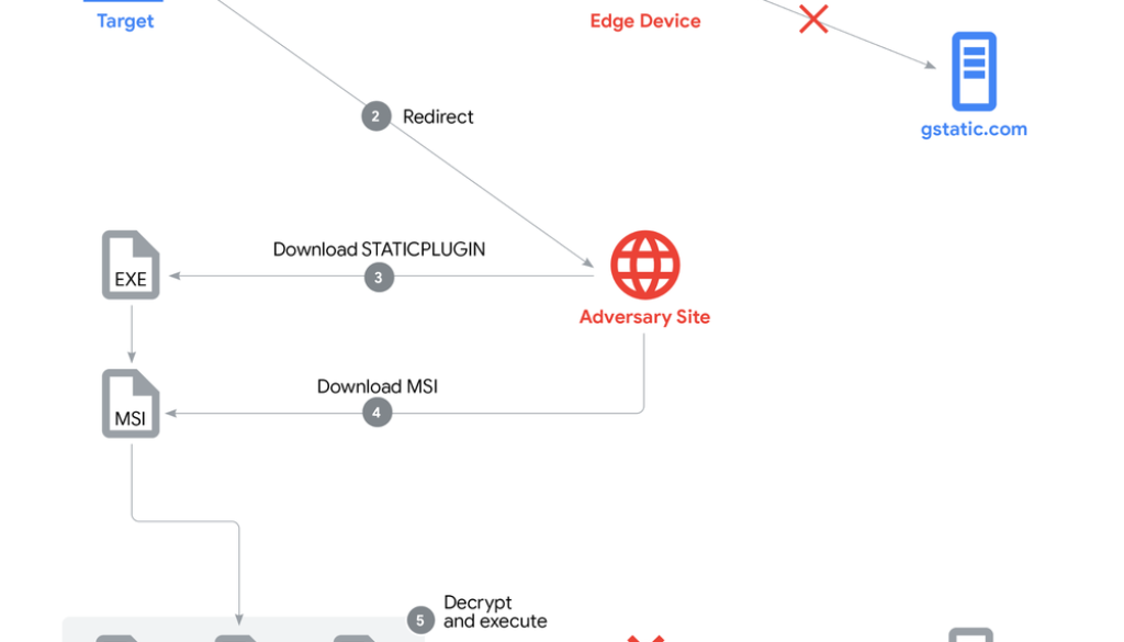 While “gstatic.com” is a legitimate domain, our investigation uncovered redirect chains from this domain leading to the threat actor’s landing webpage and subsequent malware delivery, indicating an AitM attack. We assess the AitM was facilitated through compromised edge devices on the target networks. However, GTIG did not observe the attack vector used to compromise the edge devices.