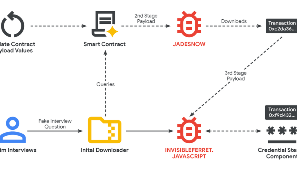 Since February 2025, GTIG has tracked UNC5342 incorporating EtherHiding into an ongoing social engineering campaign, dubbed Contagious Interview by Palo Alto Networks. In this campaign, the actor uses JADESNOW malware to deploy a JavaScript variant of INVISIBLEFERRET, which has led to numerous cryptocurrency heists.
