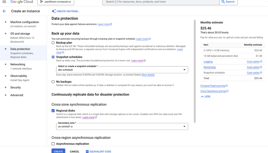 When creating a new VM through the console, simply navigate to the Data protection tab.In a project where Backup and DR has been enabled, a default backup plan will be pre-selected; if not, a snapshot schedule will be applied.