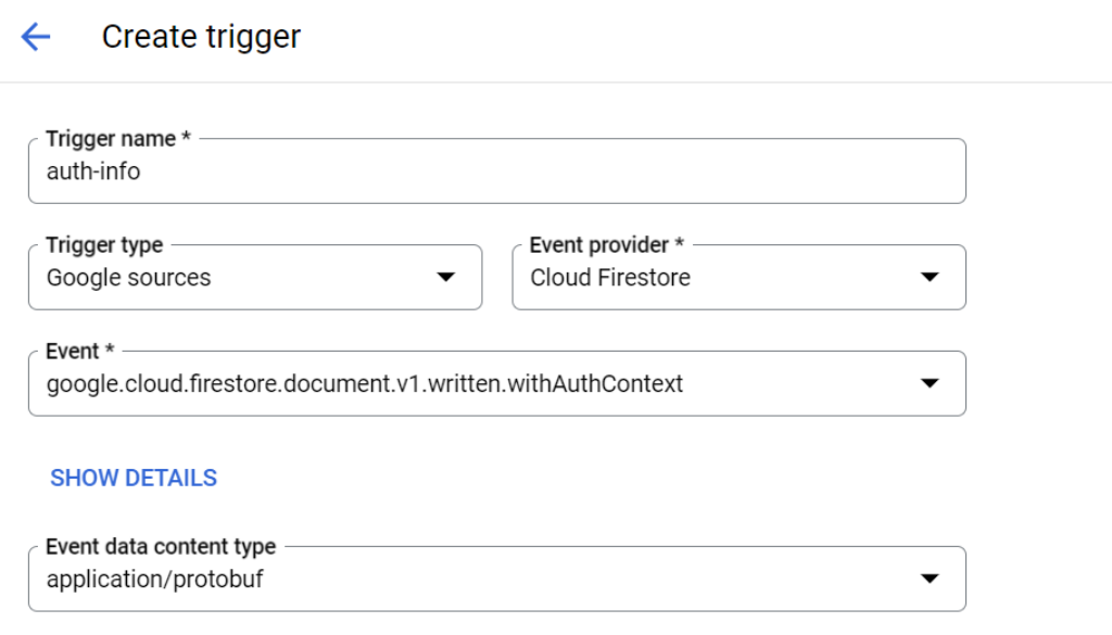 Let’s say that you want to have different logic to process events in the destinations for different auth contexts (i.e. unauthenticated or system). To set up your trigger, navigate to the Eventarc section of the Google Cloud console. You’ll need to create a new trigger for Firestore using the associated event types that include authentication information. These event types end with the suffix *.withAuthContext. We’ll want to capture newly written entities, so we’ll select google.cloud.firestore.document.v1.written.withAuthContext events: