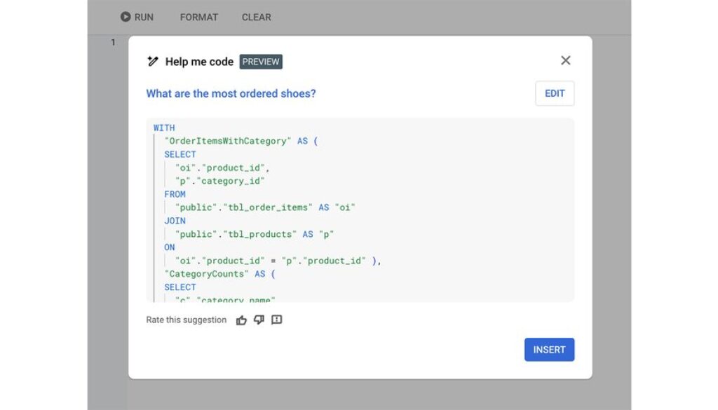 To see this in action you can do a simple test in Vertex AI Studio. Given the prompt “I have a database schema that contains products and orders. Write a SQL query that shows the number of orders for shoes”, Gemini produces SQL for a hypothetical schema: