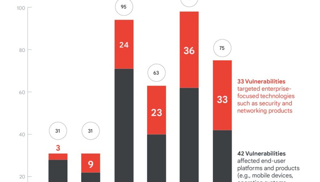 Google Threat Intelligence Group (GTIG) tracked 75 zero-day vulnerabilities exploited in the wild in 2024, a decrease from the number we identified in 2023 (98 vulnerabilities), but still an increase from 2022 (63 vulnerabilities). We divided the reviewed vulnerabilities into two main categories: end-user platforms and products (e.g., mobile devices, operating systems, and browsers) and enterprise-focused technologies, such as security software and appliances.
