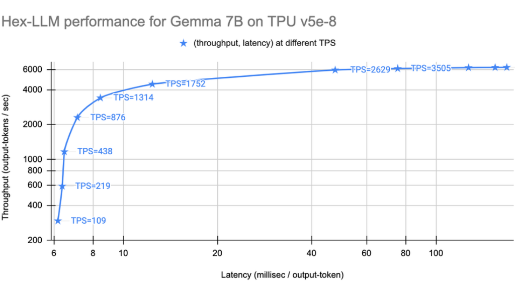 Gemma 7B model: 6ms per output token for the lowest TPS, 6250 output tokens per second at the highest TPS;