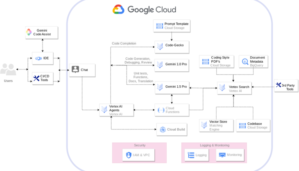 Gemini Code Assist & Gemini 1.0 Pro: Gemini Code Assist bridges the IDE and Gemini 1.0 Pro, allowing developers to interact with Gemini. It facilitates user queries, provides contextual information, and generates code snippets based on the user’s requirements within the solution.