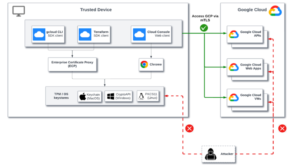 Strong key protection: CBA’s use of mTLS leverages secure cryptographic storage such as TPMs and OS keystores. Tooling such as Enterprise Certificate Proxy (ECP) are offered to users that empower them to safeguard private keys helping to ensure keys remain inaccessible to attackers without physical device access.