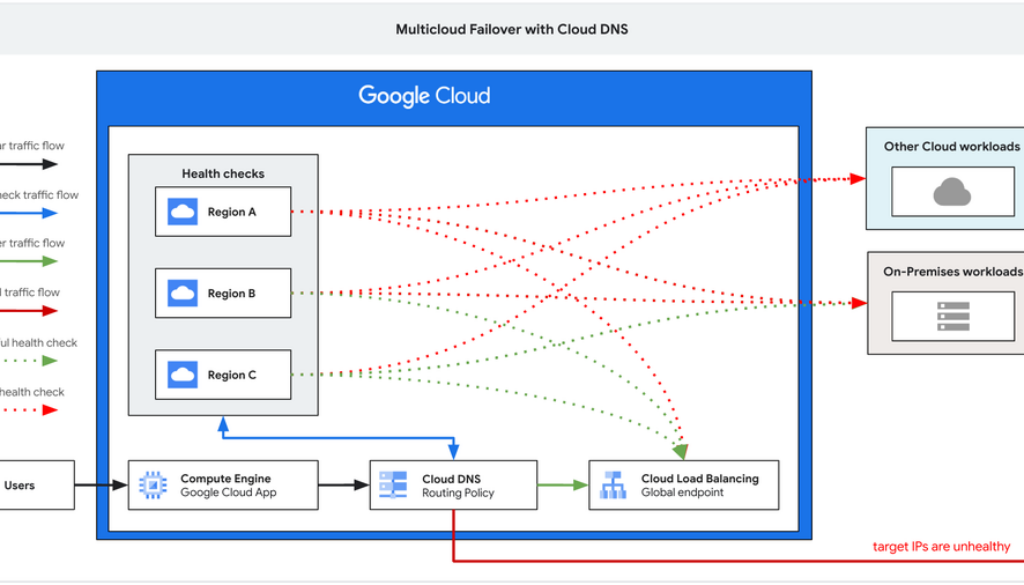Cloud DNS uses routing policies and health checks to direct traffic to healthy backends. These health checks probe internet-based endpoints — any public IP address on other cloud providers, on-premises environments, or even other load balancers. To help improve outage detection in multicloud deployments, health checks are regionalized, originating from points of presence near Google Cloud regions. A backend is considered healthy when a majority of these regional probes report a successful connection. Based on these health checks, Cloud DNS routing policies automatically direct traffic away from failing backends. This automated process happens at the DNS level, providing a crucial layer of control and traffic steering across your infrastructure.