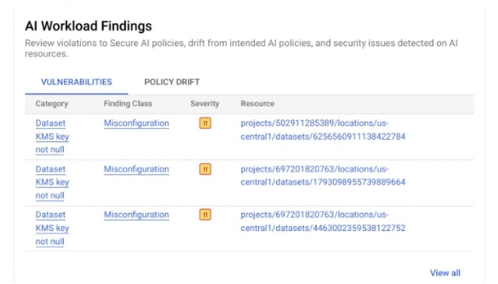 Security Command Center also notifies security managers when policies have been changed, which can help teams to quickly determine whether posture controls have been relaxed due to policy misconfiguration or malicious intent. Additionally, it supports Security Health Analytics (SHA) to identify common misconfigurations and vulnerabilities across other services used by AI workloads, including compute, storage, and networking.