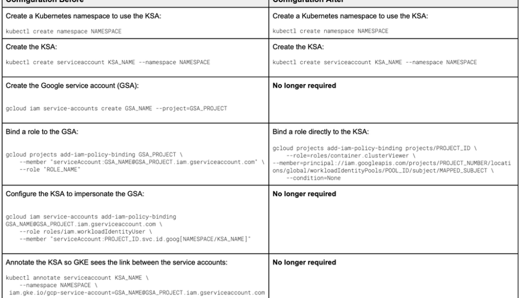 Previously, a workload on GKE needed to impersonate a Google Cloud service account with its Kubernetes service account (KSA) in order to enable Pod access to Google Cloud services. Although this improved security, we heard from many users that it was difficult to set up. Having to maintain both a Kubernetes service account and a Google Cloud service account for every Kubernetes workload also contributed to a sprawl of identities that needed to be managed and audited.