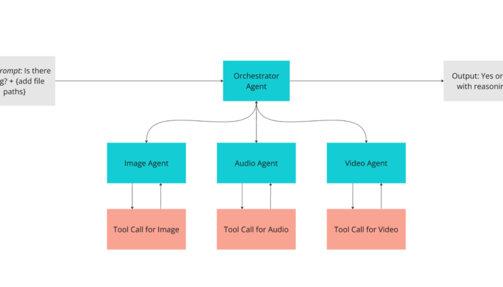 This gen AI workflow entails a user asking the agent to verify if a specific object exists in the provided files. The Orchestrator Agent will call relevant worker agents: image_agent, audio_agent, and video_agent while passing the user question and the relevant files. Each worker agent will call respective tooling to convert the provided file to base64 encoding. The final finding of each agent is then passed back to the Orchestrator Agent. The Orchestrator Agent then synthesizes the findings and makes the final determination. This code can be used as a starting point template where you need to ask an agent to reason and make a decision or generate conclusions from different sources.