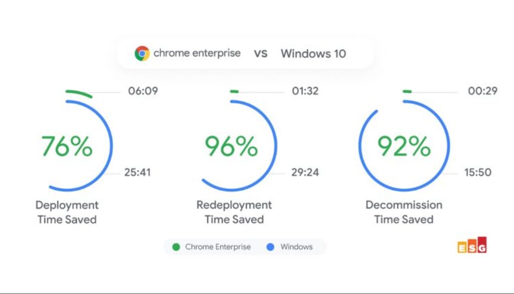 Recently, Enterprise Strategy Group (ESG) ran a study to define the time savings throughout the lifecycle in comparison to deployment of PCs. In their lab, ESG reported on the steps required to deploy, redeploy, and deprovision devices, along with the amount of time it took. Their study found a 76% time savings during device deployment, a 96% time savings during redeployment to new users, and a 92% time savings during deprovisioning when using Chromebooks over PCs. To read more about their findings, check out their report.