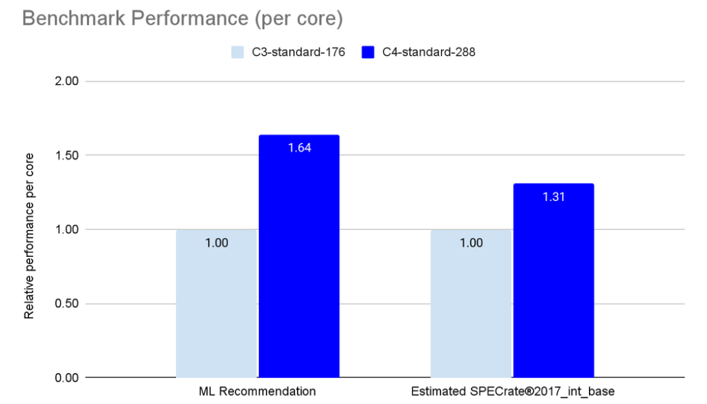 Inference workloads on C4 with Xeon 6 demonstrate up to 60% better performance per core compared to prior-generation C3. C4’s new shapes support FP16-trained models with Intel AMX-FP16, making it a great choice for accelerating machine learning inference. Also, a new larger half- and full-host C4 shape (144 and 288 vCPU) guarantees memory isolation, for highly predictable performance. The largest C4 shape enables up to 30% more performance per core on the estimated SPECrate®2017_int_base benchmark versus C3.