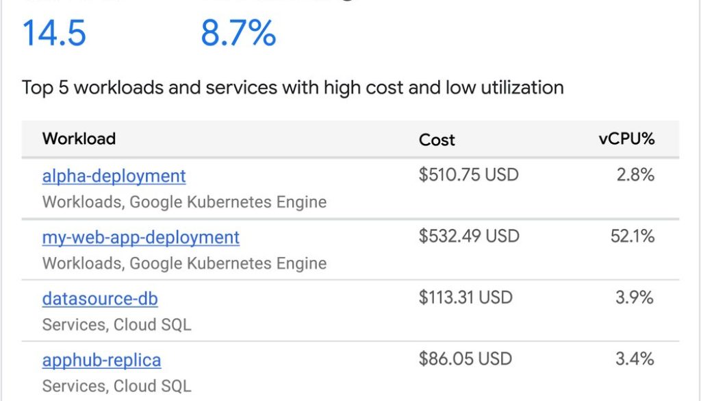 We have additionally integrated granular cost data from Cloud Billing and resource utilization data from Cloud Monitoring to give you a comprehensive picture of your cost efficiency. This includes average vCPU utilization for your Project, which helps you find the most promising optimization candidates across hundreds of Google Cloud Projects.