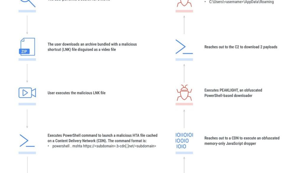 Mandiant Managed Defense identified a memory-only dropper and downloader delivering malware-as-a-service infostealers. During our investigation, Mandiant observed the malware download payloads such as LUMMAC.V2 (LUMMAC2), SHADOWLADDER, and CRYPTBOT. Mandiant identified the initial infection vector as a Microsoft Shortcut File (LNK) that connects to a content delivery network (CDN) hosting an obfuscated memory-only JavaScript dropper. Analysis of the payload revealed that it executes a PowerShell downloader script on the host. Mandiant named this final downloader PEAKLIGHT.
