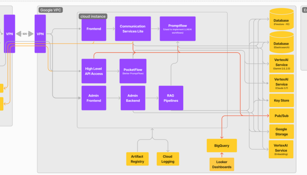 In addition to these core components, Pluto AI also utilizes other Google Cloud services to help develop production-ready applications, such as Cloud Logging, Pub/Sub, Cloud Storage, Firestore, and Looker.