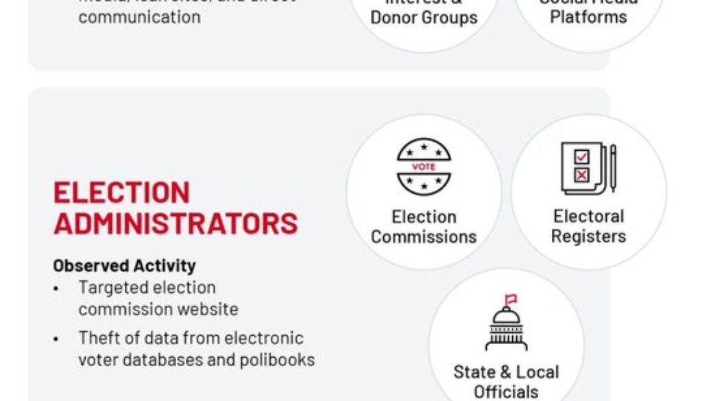 The attack surface of an election involves a range of entities. This includes election systems and infrastructure, election administrators, entities involved in running the election, and organizations involved in political campaigning — including news and media organizations (Figure 1). The ease of targeting and nature of cyber threat activity (cyber espionage, information operations, extortion, etc.) can vary across entities within these categories.