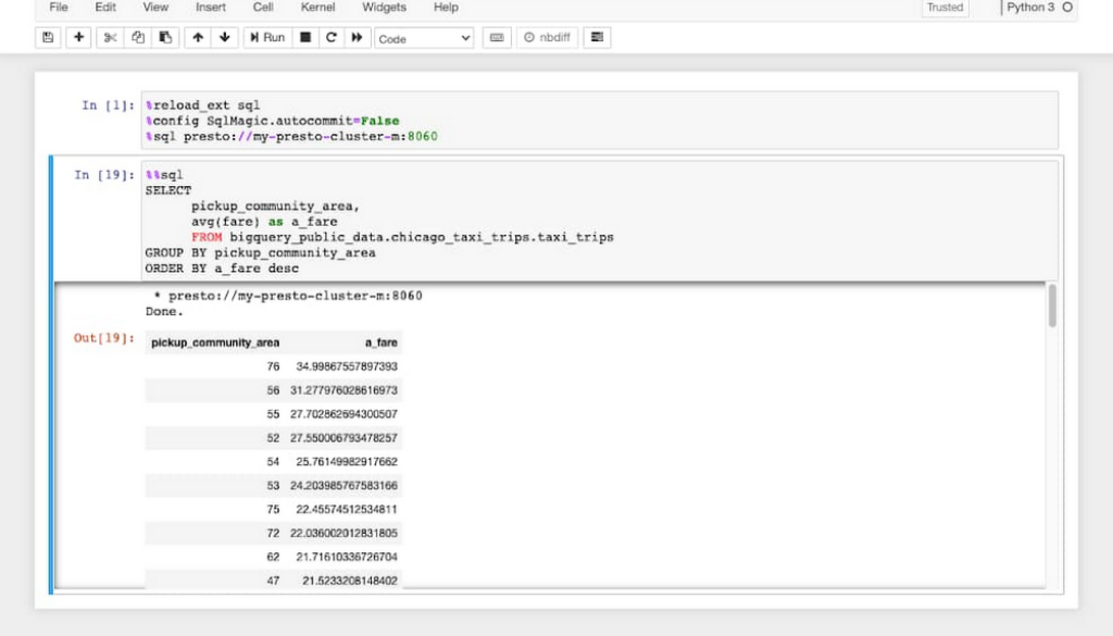 Using Dataproc Hub or the Jupyter optional component, with ipython-sql, you can execute Presto SQL queries from a Jupyter Notebook. In the first cell of your notebook, run the following command: