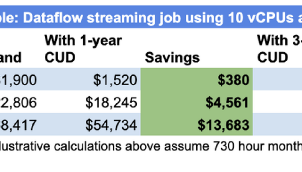As streaming analytics and machine learning needs continue to grow, customers with predictable processing volumes want to better optimize their Dataflow costs. Today, we are announcing the general availability of Dataflow streaming committed use discounts (CUDs), providing a new way for you to save money on a key driver of your streaming costs: streaming compute. By committing to a baseline amount of Dataflow streaming compute usage for a one-year or three-year period, you can get deeper discounts: a 20% discount for a one-year commitment, and a 40% discount for a three-year commitment.