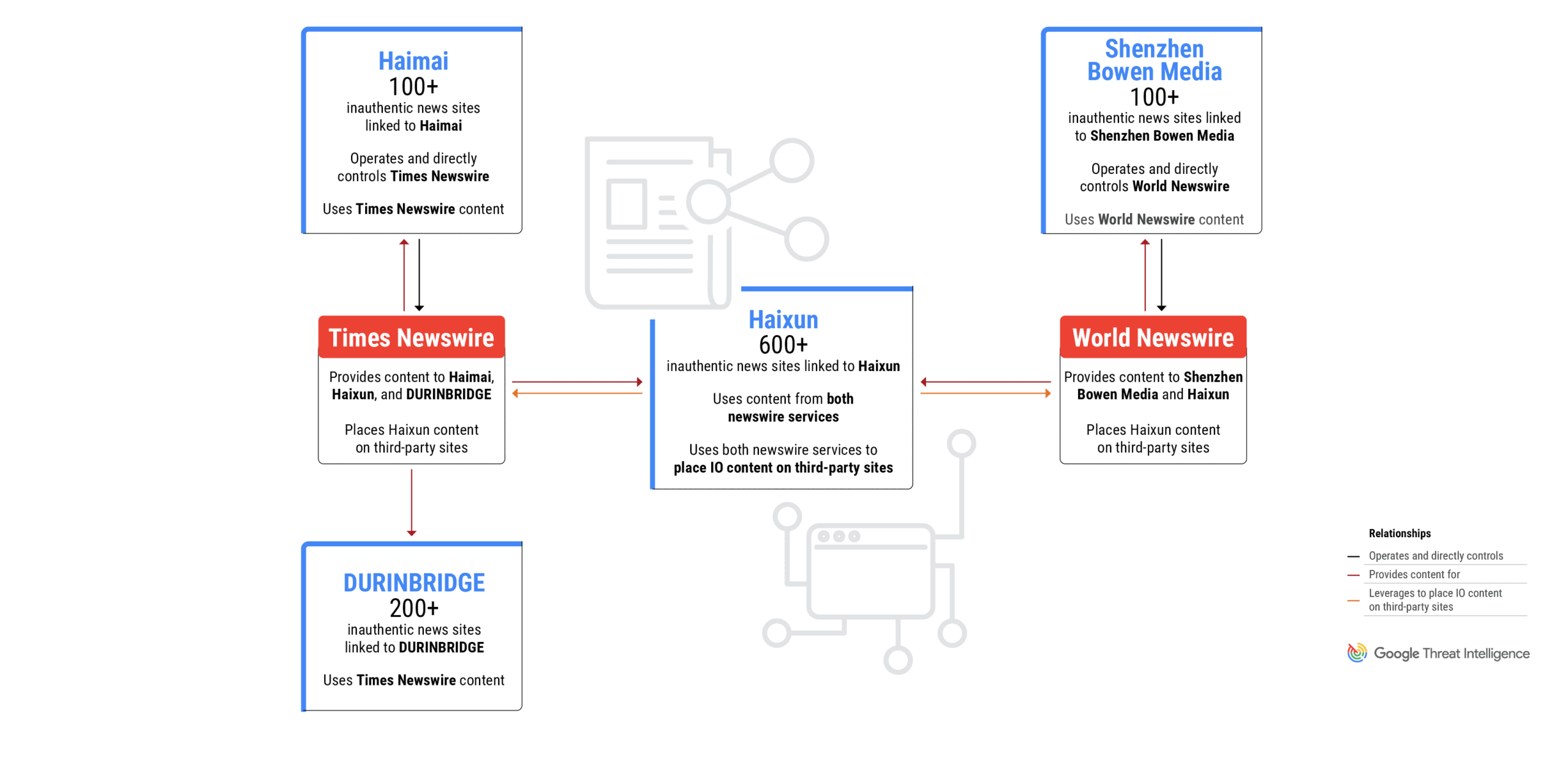 Another example of a commercial firm distributing content linked to pro-China IO campaigns is DURINBRIDGE, an alias we use to track a technology and marketing company that has multiple subsidiaries that provide news and PR services. DURINBRIDGE operates a network of over 200 websites designed to look like independent media outlets that publish news content on various topics. These domains violated our policies and have been blocked from appearing on Google News surfaces and Discover.