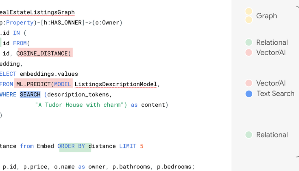 Fig1: A SQL query on Spanner showing interleaved usage of graph, relational, and vector models and full-text search