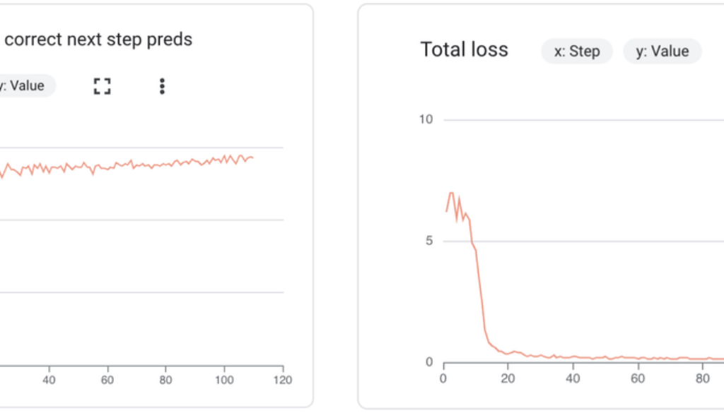 Fraction of correct next step predictions measures the model’s accuracy in predicting the next item in a sequence. This metric should increase over time, reflecting the model’s growing accuracy in sequential prediction.