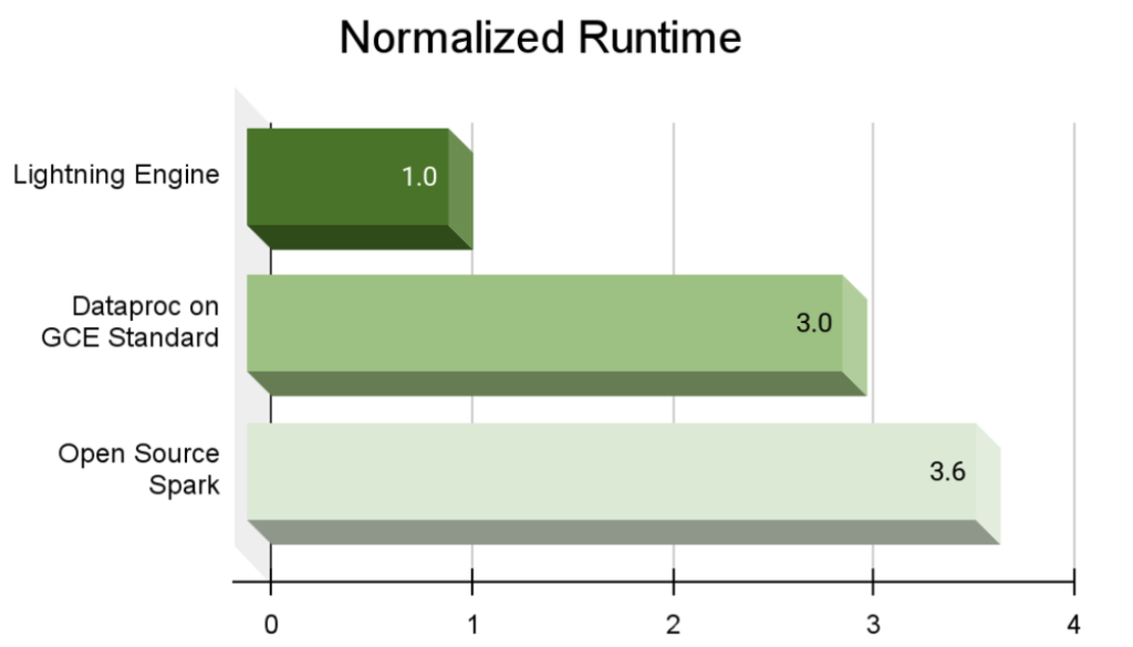 - High performance: Currently in preview, the Lightning Engine Spark engine provides 3.6x better performance compared to open-source Apache Spark, thanks for traditional optimization techniques like query and execution optimizations, as well as optimizations in the file-system layer and connectors. It is fully compatible with open-source Apache Spark, and can plug into existing workloads running Dataproc on Google Compute Engine.