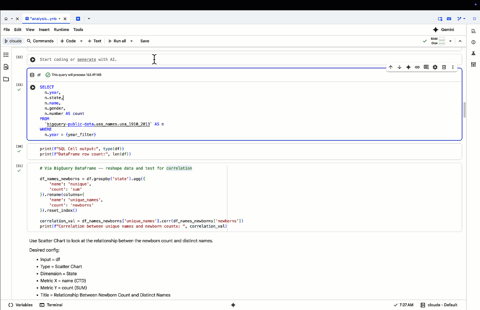 Today, we are launching fundamental enhancements to Colab Enterprise notebooks in BigQuery and Vertex AI. We’ve added native SQL cells (preview), so you can now iterate on SQL queries and Python code in the same place. This lets you use SQL for data exploration and immediately pipe the results into a BigQuery DataFrame to build models in Python. Furthermore, rich interactive visualization cells (preview) automatically generate editable charts from your data to quickly assess the analysis. This integration breaks the barrier between SQL, Python, and visualization, transforming the notebook into an integrated development environment for data science tasks.