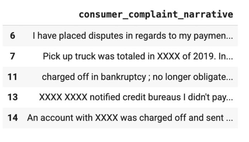 For the transformations in this solution, you will isolate the consumer_complaint_narrative column of the DataFrame, which includes the original complaint as unstructured text, while using the dropna() panda to drop any rows that contain NULL values for that field.