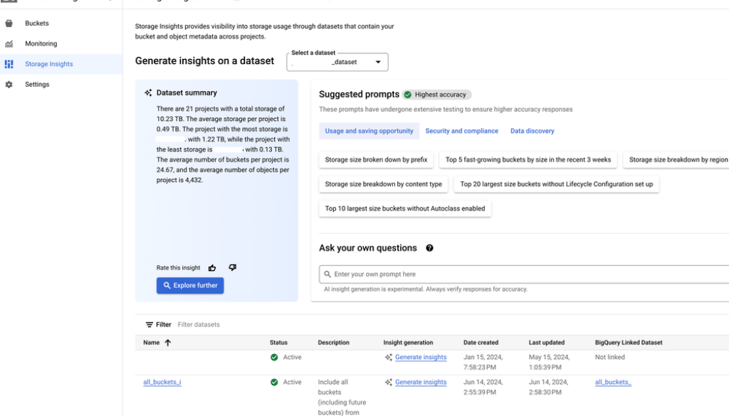 To get started, you need to set up the Storage Insights Dataset, a new feature that collects and centralizes all bucket and object metadata across your Google Cloud projects and regions in a BigQuery linked dataset. Each dataset is refreshed every 24 hours and can retain up to 90 days of historical data. During the dataset setup, you need to select insight generation with the Gemini option.